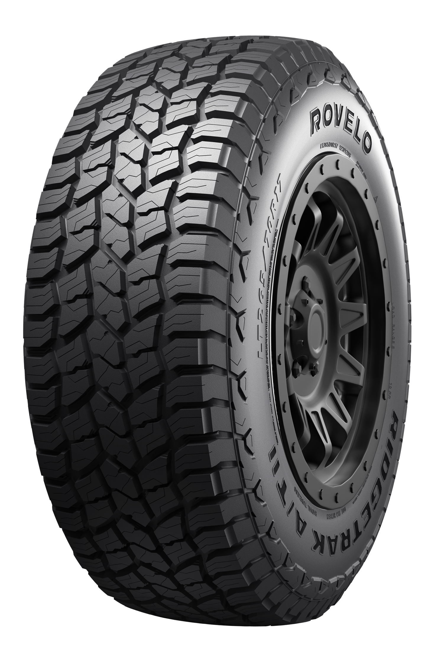 The Rovelo Ridgetrak A/T II offers upgraded all-terrain performance for pickup trucks and SUVs. Its aggressive tread design features deep tread depth and a wide contact patch to provide confident grip and control across all surfaces. Certified with the 3PMS symbol, it delivers reliable traction even in challenging winter conditions. Engineered for durability and off-road confidence without sacrificing ride comfort, the Ridgetrak A/T II keeps you in control wherever the road or trail takes you.